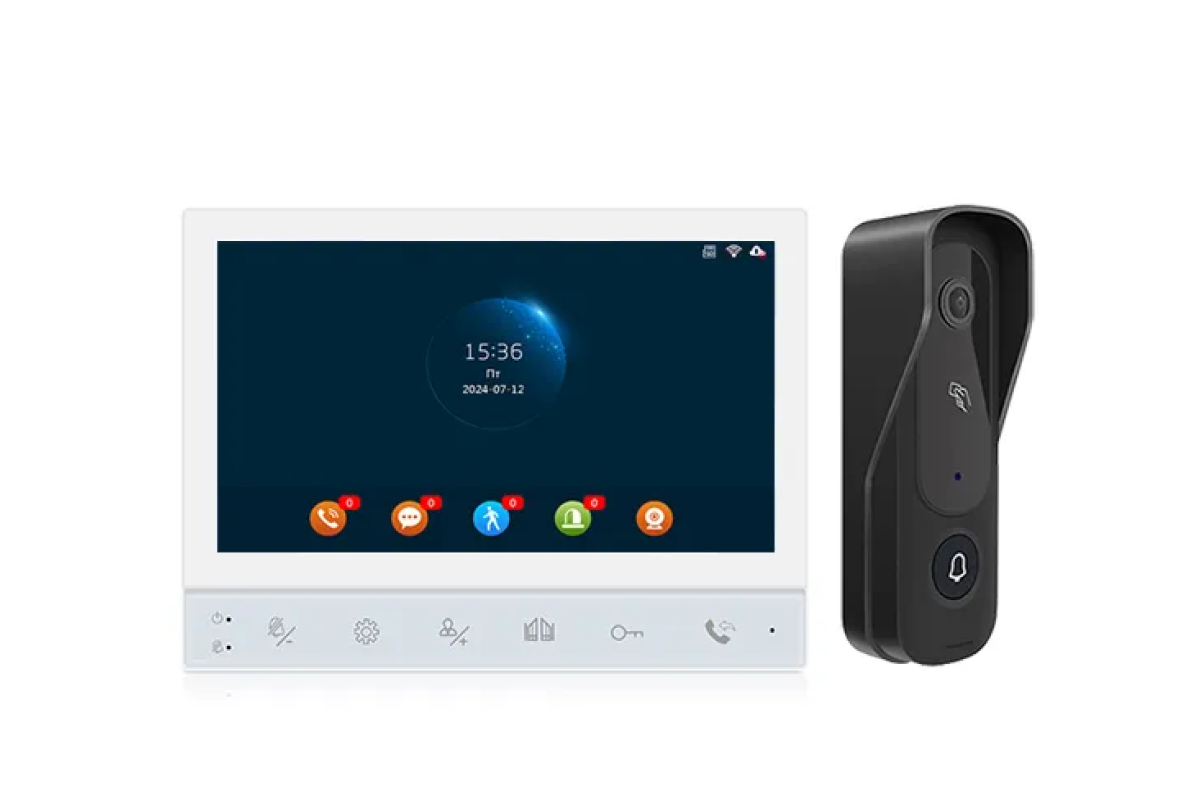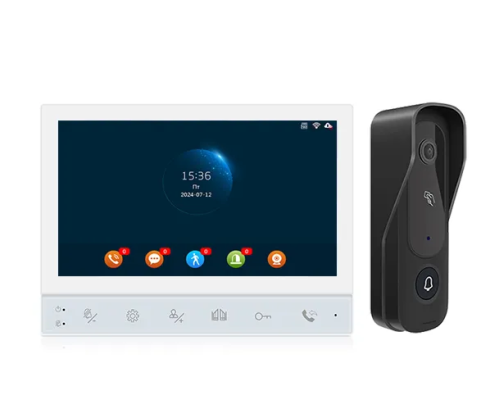 Комплект: видеодомофон FHD с WIFI и видеопанель FHD с контроллером и считывателем MF. Цветной домофон(AT-I-M741F/TW White)FHD с TFT экраном(1024x600)7 дюймов. Детектор движения, запись и сенсорные кнопки управления. Подключение 2 вызывных панелей 1080P AHD/TVI/CVI или CVBS, 2 видеокамер 1080P AHD/TVI/CVI или CVBS, 2 датчиков тревоги, адресный интерком. Разговор по громкой связи. Соединение с вызывной панелью 4-проводное. Слот microSD до 128 Гб, питание~100-240В или DC12В, потребление 600мA, в режиме ожидания 250мA. Корпус белого цвета. Размеры 190x125x22мм. Подключение по WiFi или Ethernet RJ45. Приложение Smart Life. Цветная накладная видеопанель(AT-I-D51C/CR Black)чёрного цвета с FHD(1920x1080)матрицей. Встроенный контроллер и считыватель MF(Mifare). Угол обзора 130°. 4-х проводное подключение к домофону. Подключение всех типов электрозамков(NO/NC). Рабочая темпера