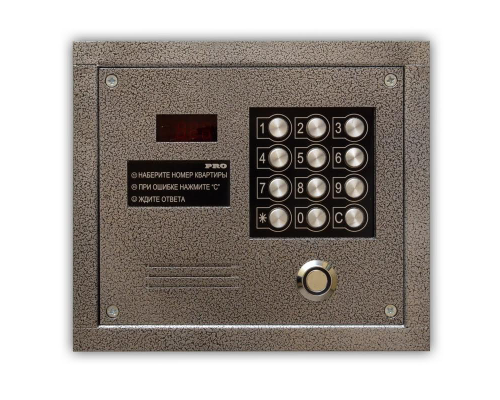 Многоквартирный цифровой домофон. Максимальное количество абонентских устройств: 255. Вводимые номера от 1 до 999. Предустановленная память обеспечивает работу с 1000 TM-ключами, возможно увеличение количества до 4000. Работа с идентификаторами одного из 3-х стандартов: DS1990A, EM-Marine или Mifare. Дополнительные режимы контроллера: *АВТОСБОР*, *ТЕСТ*. Световая и звуковая индикация, подсветка наборного поля клавиатуры. Антивандальный корпус. Диапазон рабочих температур варьируется от -40°С до +50°С. Напряжение питания: DC 15В. Размер: 210х180х35 мм. Цвет: серебряный антик.